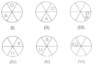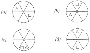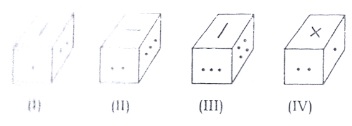 Rotated positions of a single solid are shown below. The various faces of the solid are marked with different symbols like dots, cross and line. Answer the three items that follow the given figures