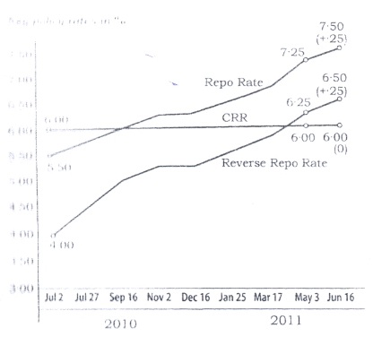 63. The graph given below indicates the changes in key policy rates made by the Central Bank several times in a year: