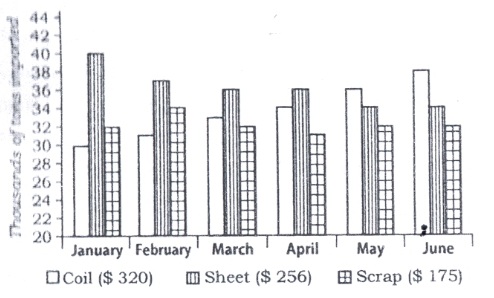 The following three items are based on the graph given below which shows imports of three different types of steel over a period of six months of a year. Study the graph and answer the three items that follow.